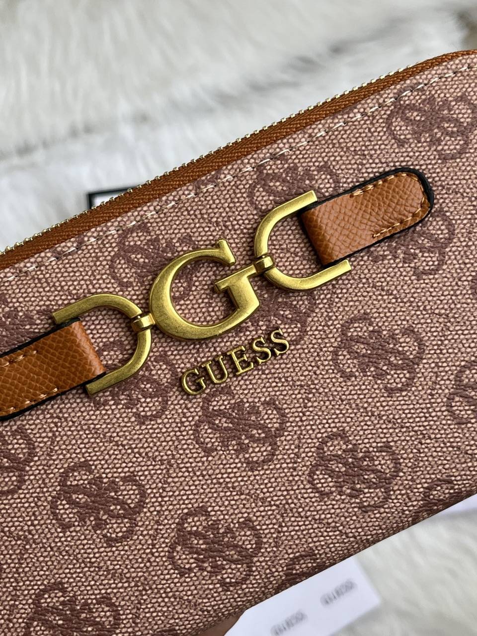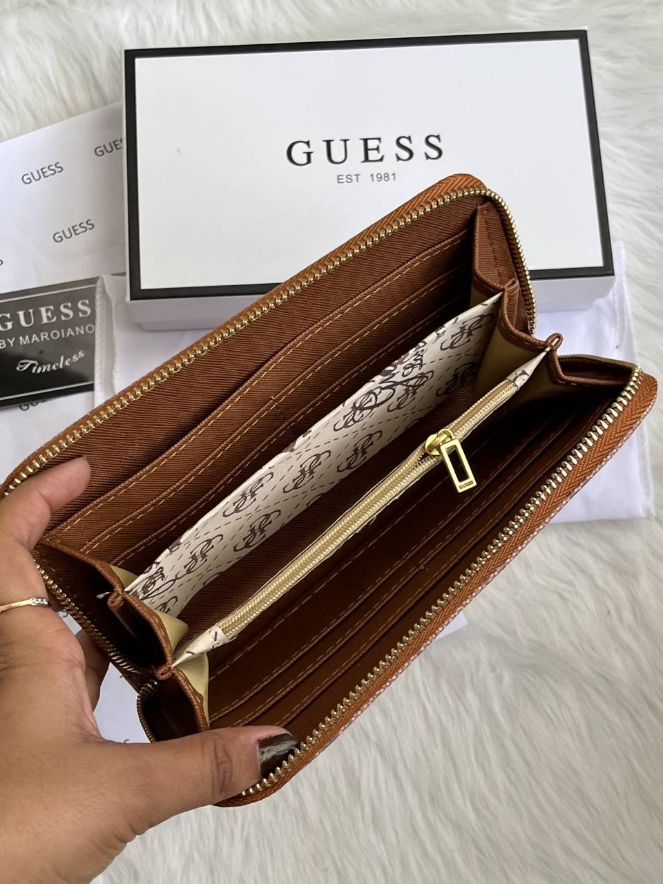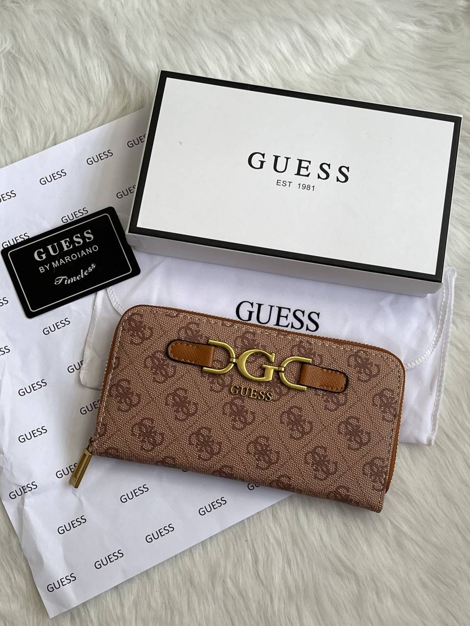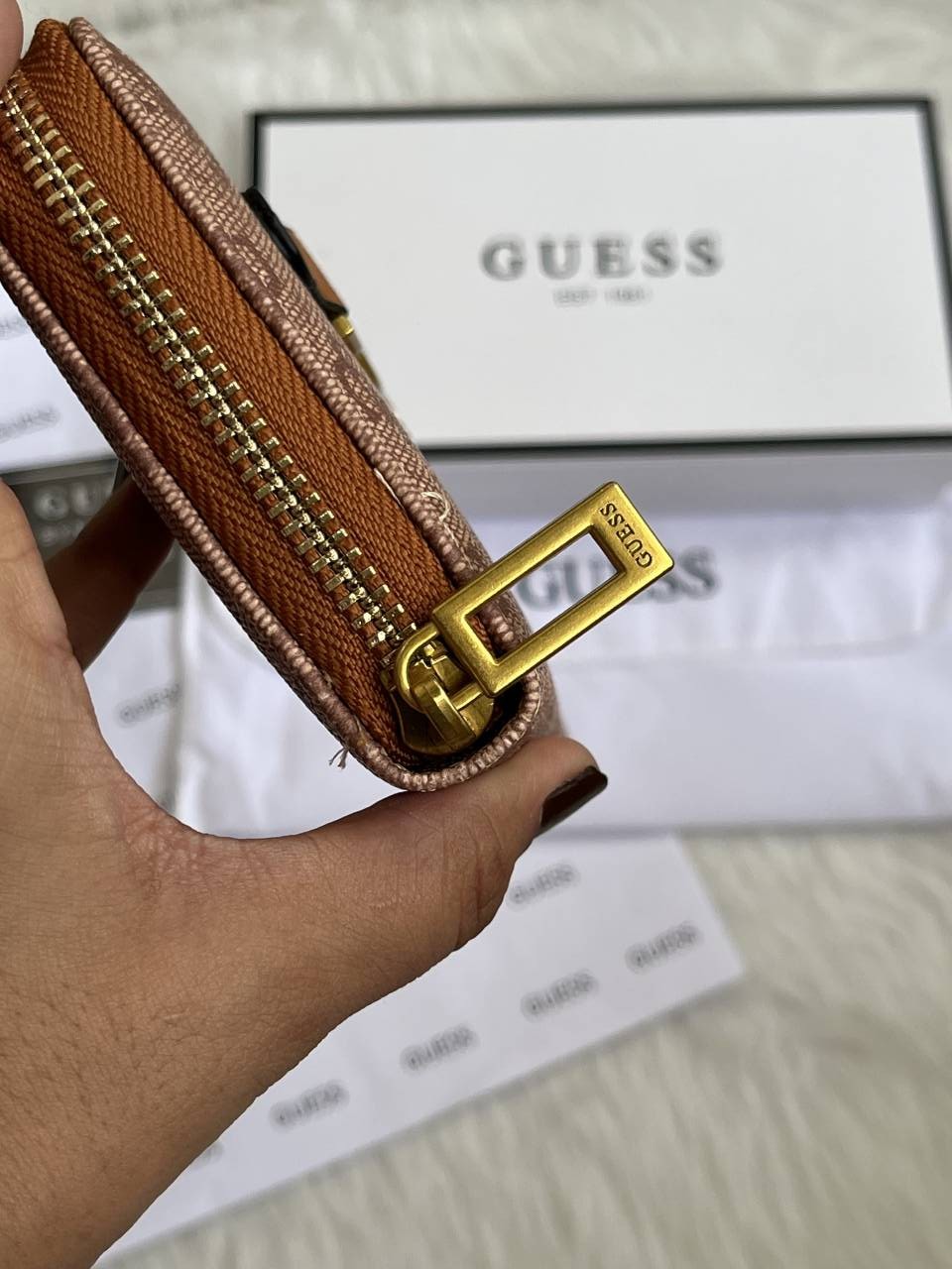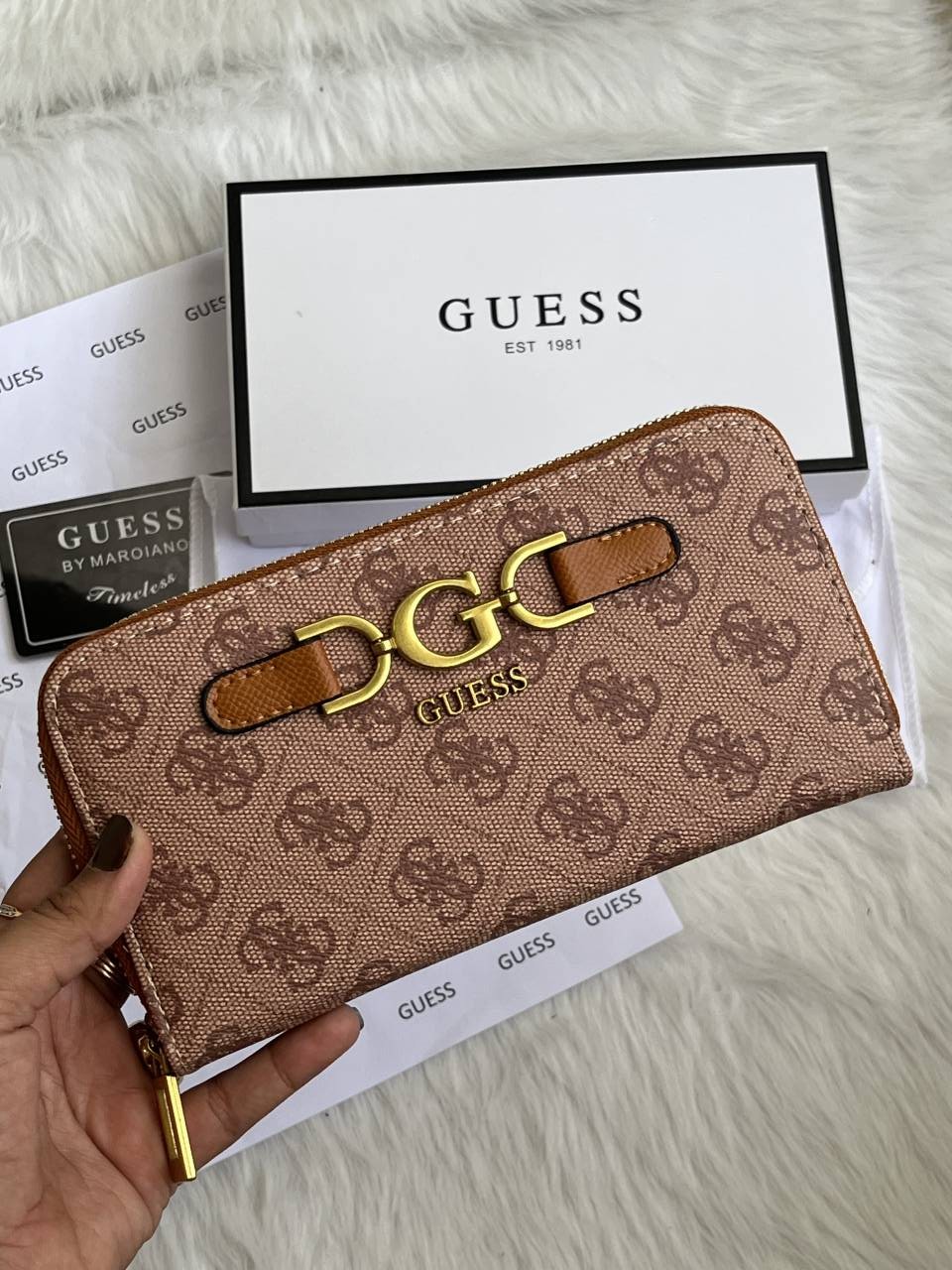 Guess 001 Light Apricot Long Zippy Wallet With Original Box Dust Cover Card & Brand Packaging